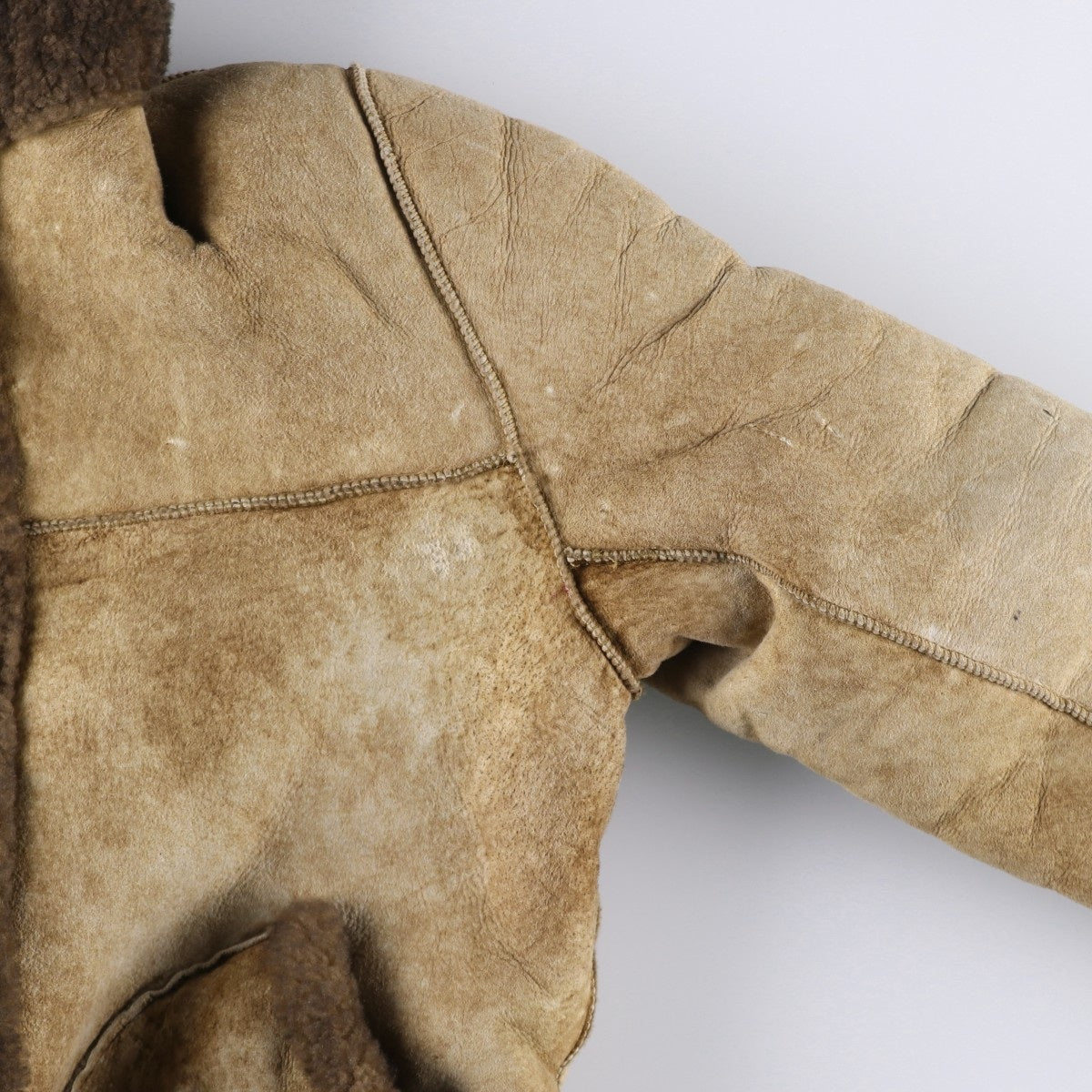 - Side A (light brown) front, chest and both arms rubbed, left arm torn, stain