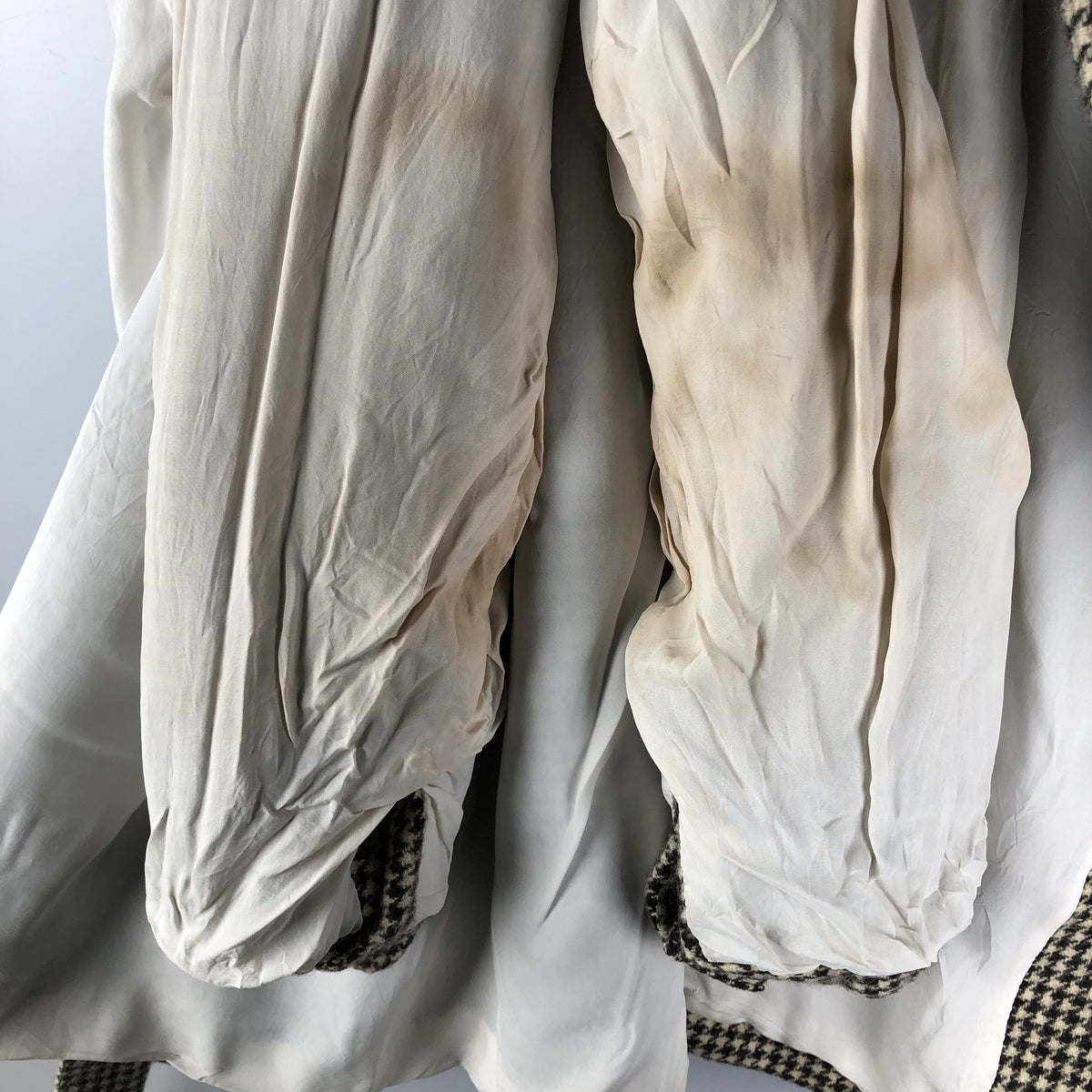 -Stain on the inside, neck, both arms, both sleeves, back, right abdomen, waist, and hem. Repair marks on shoulder.