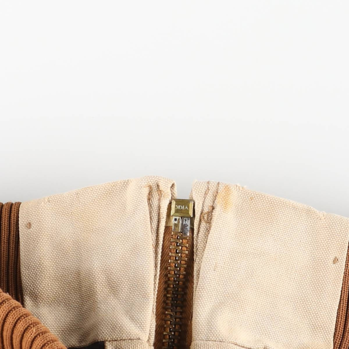 - Front, hood cord is wavy, zipper end tape is peeling, left arm is chafed, hem is torn.