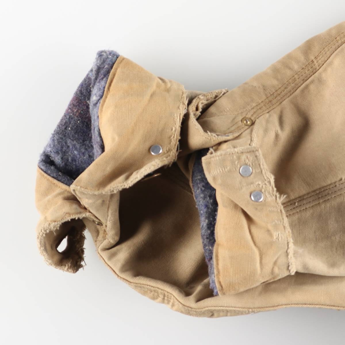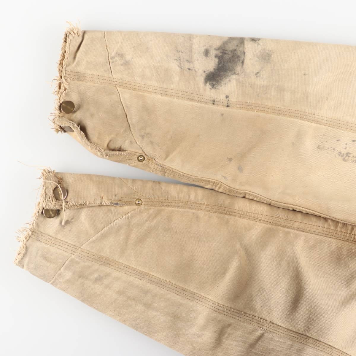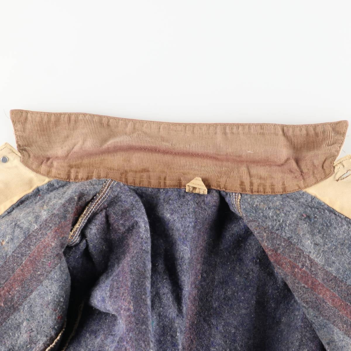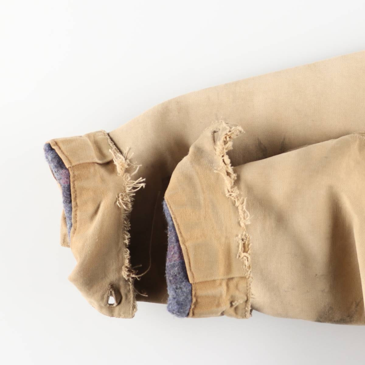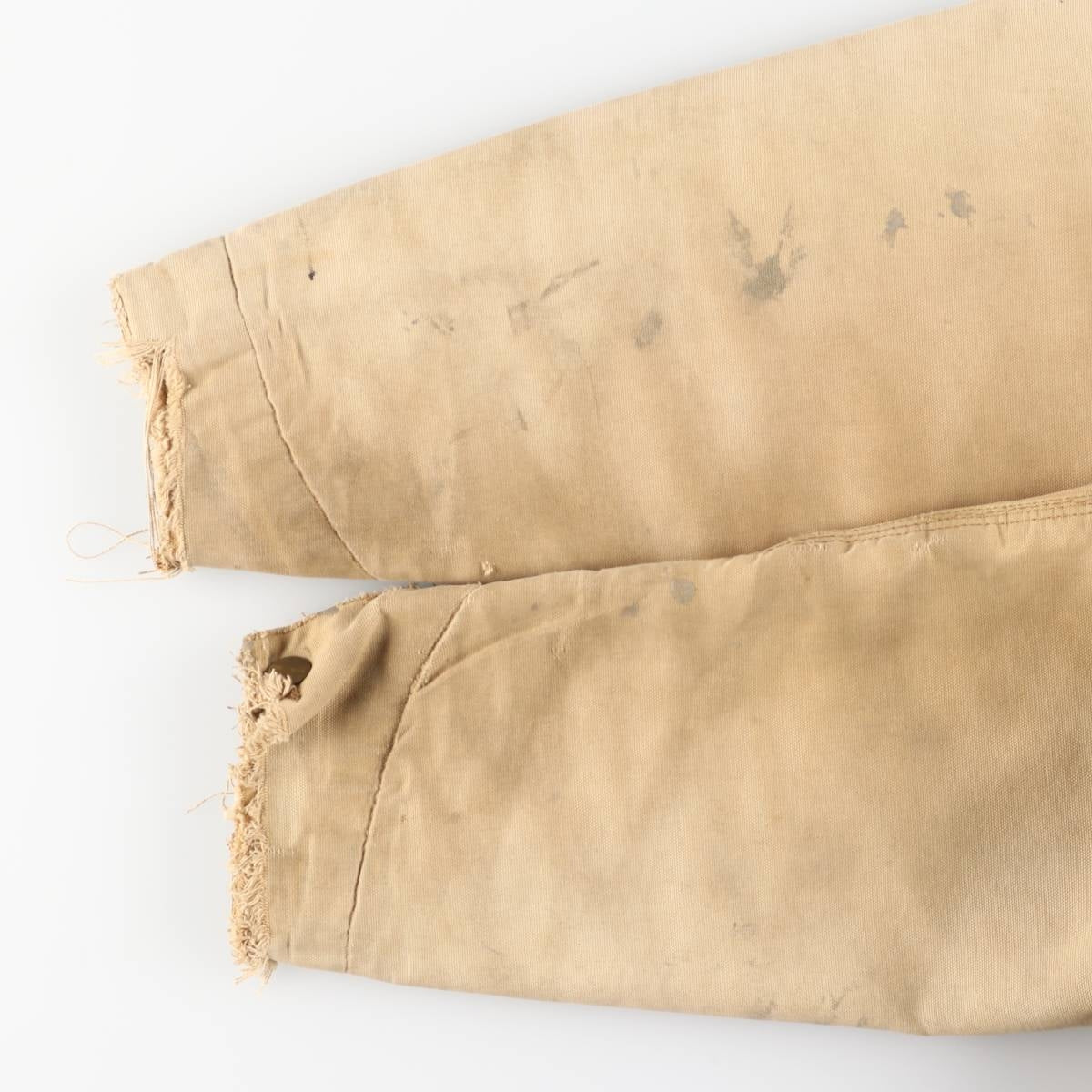 -Inside, stains and tears on both sleeve ends and hem, and abrasion around the neck.