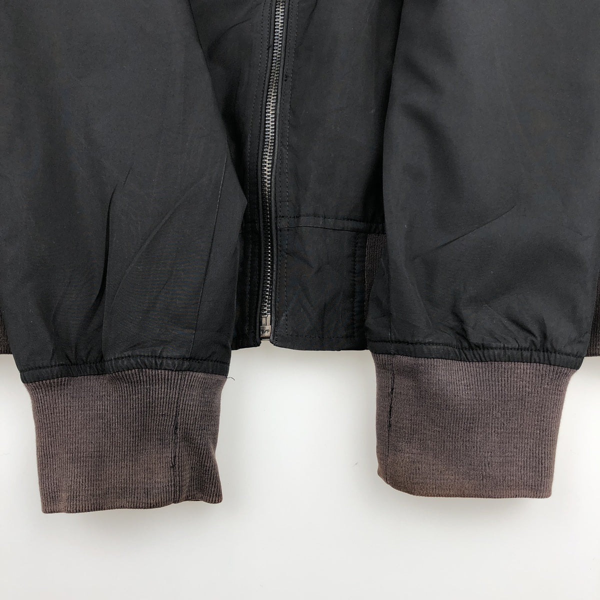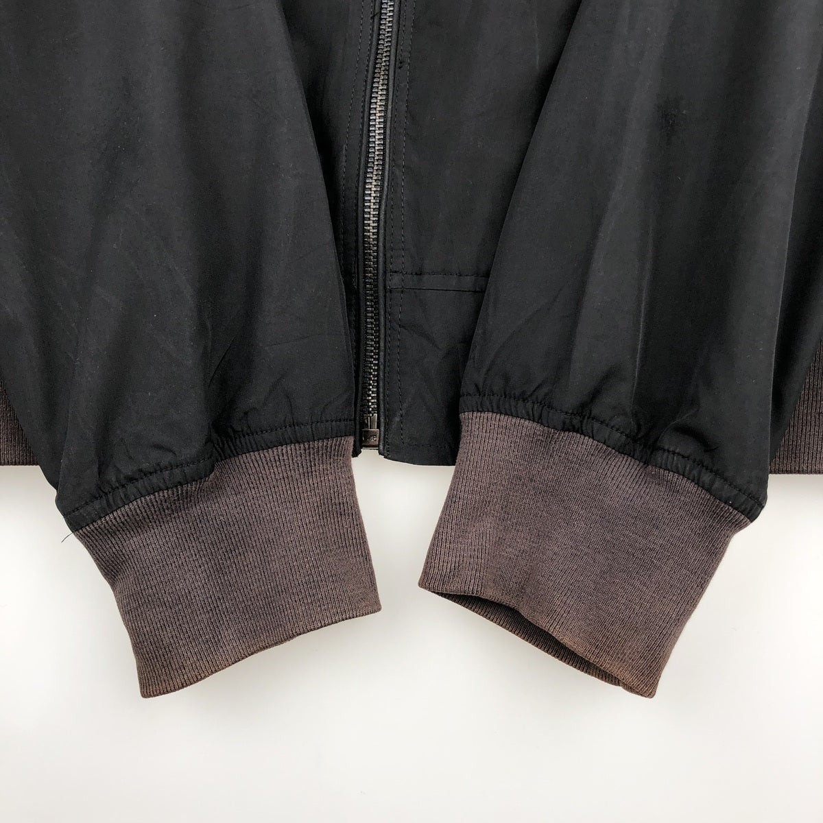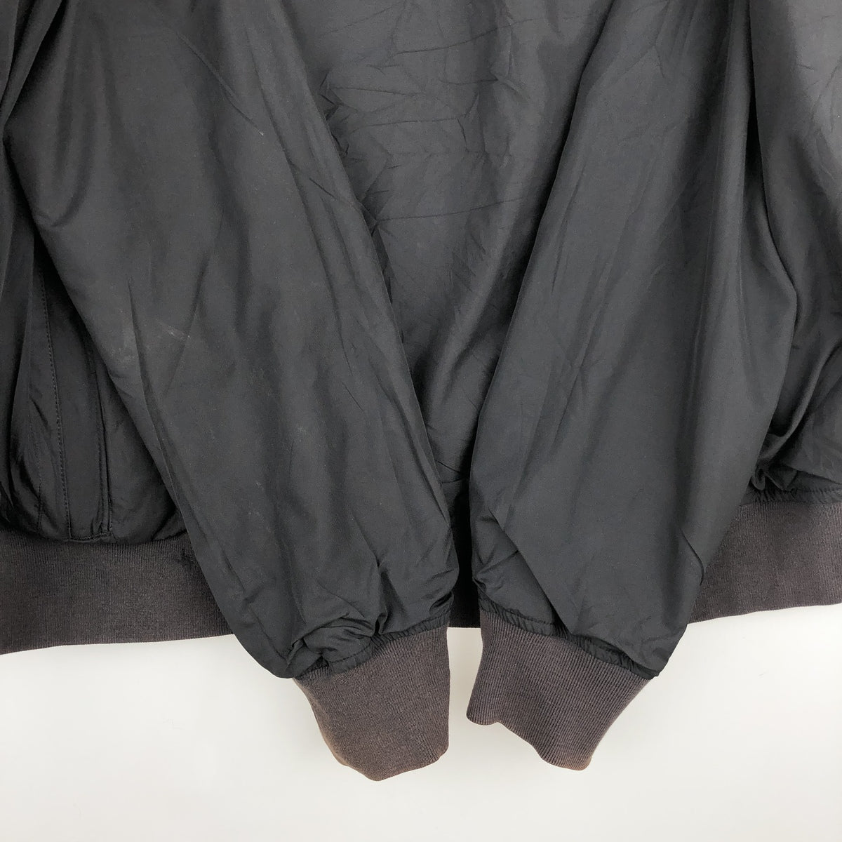 -Stains on the front, right shoulder, both sides of the abdomen, both hems, and both sleeves. Loose threads on the collar. Repair marks on both sleeves.