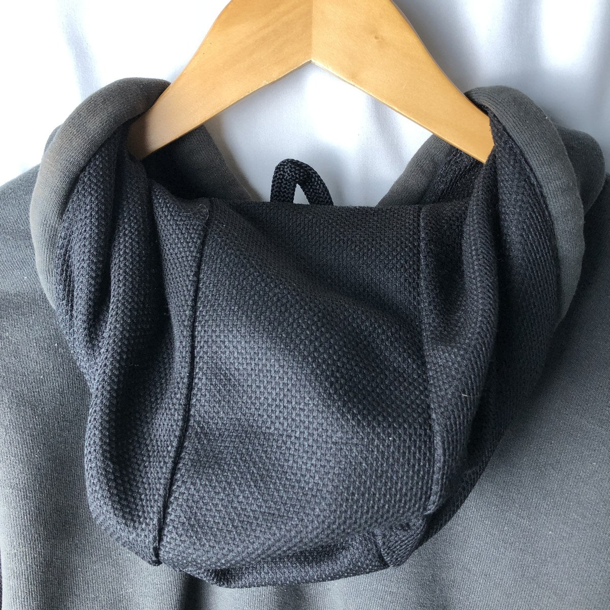- Inside, hood area: thread snag at hem, stain on left hip, abrasion on right hip.