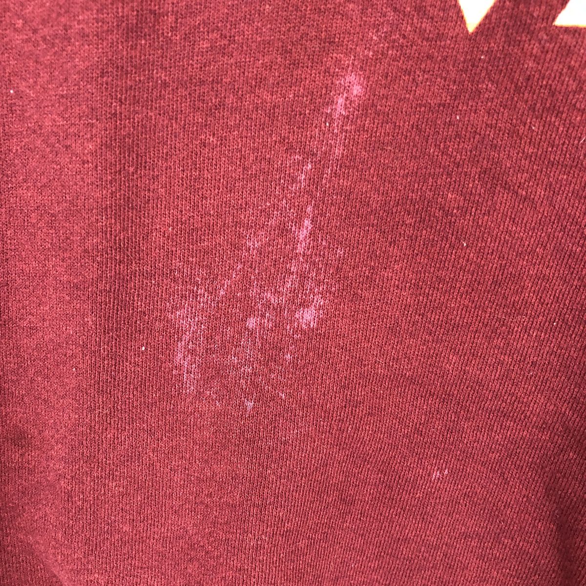- Front, right shoulder: hole. Stain on right arm. Peel on left sleeve cuff.