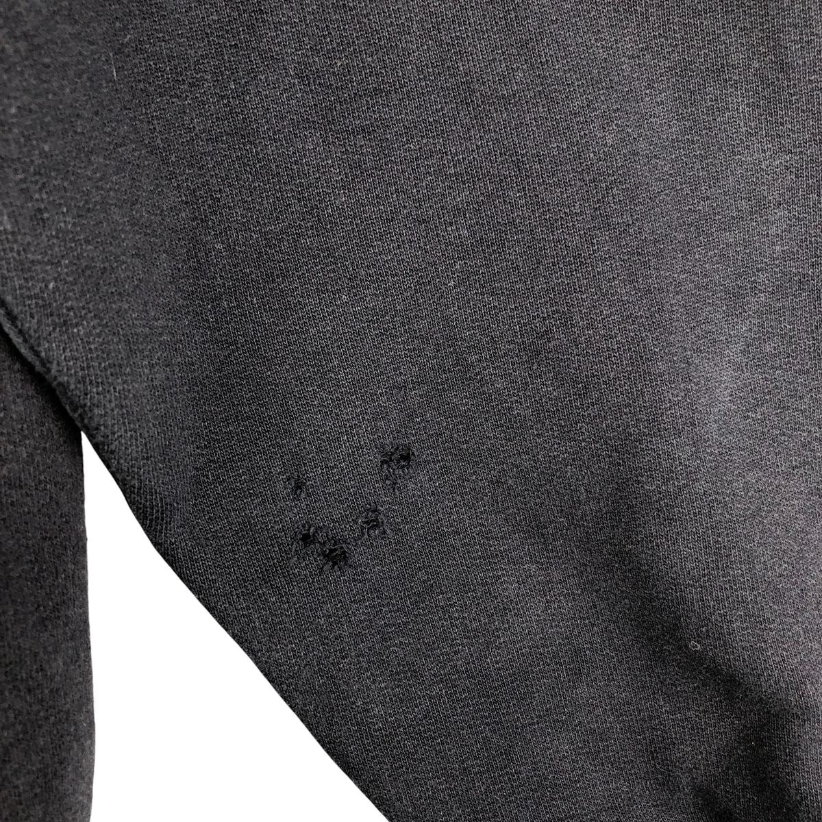 -Tears on the front, left arm and left sleeve end. Stain on left sleeve end and chest. Rubbing on chest.