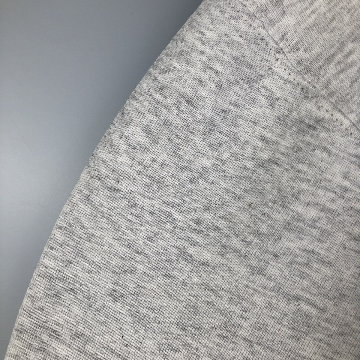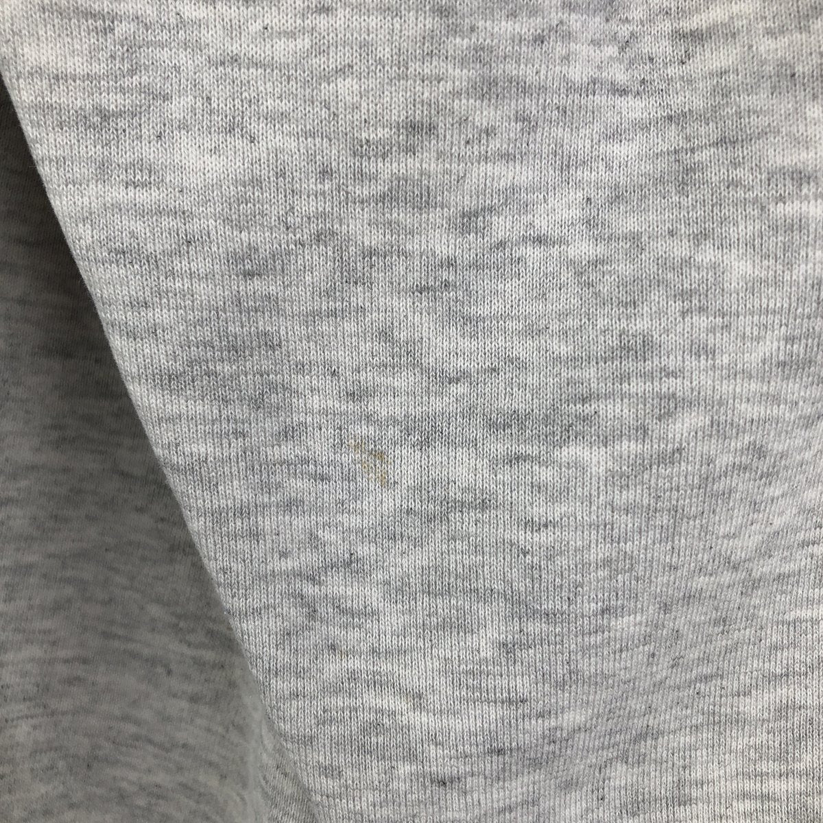-Print peeling on the front, rubbing on the right arm and right chest, loose threads at the neckline, stains on the right sleeve, abdomen and left hem