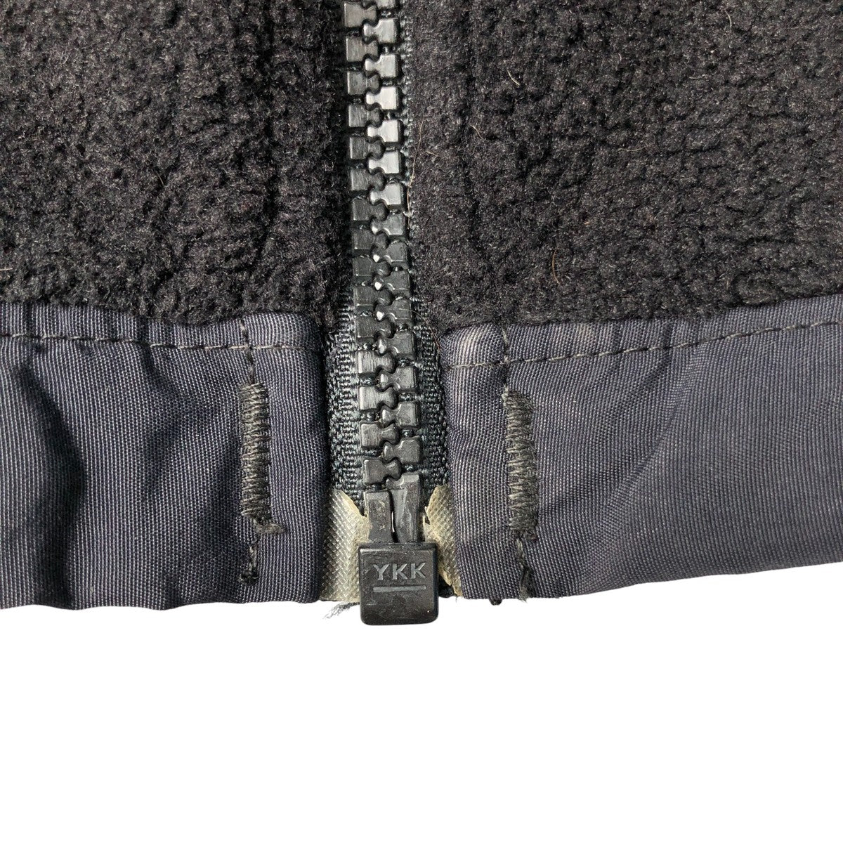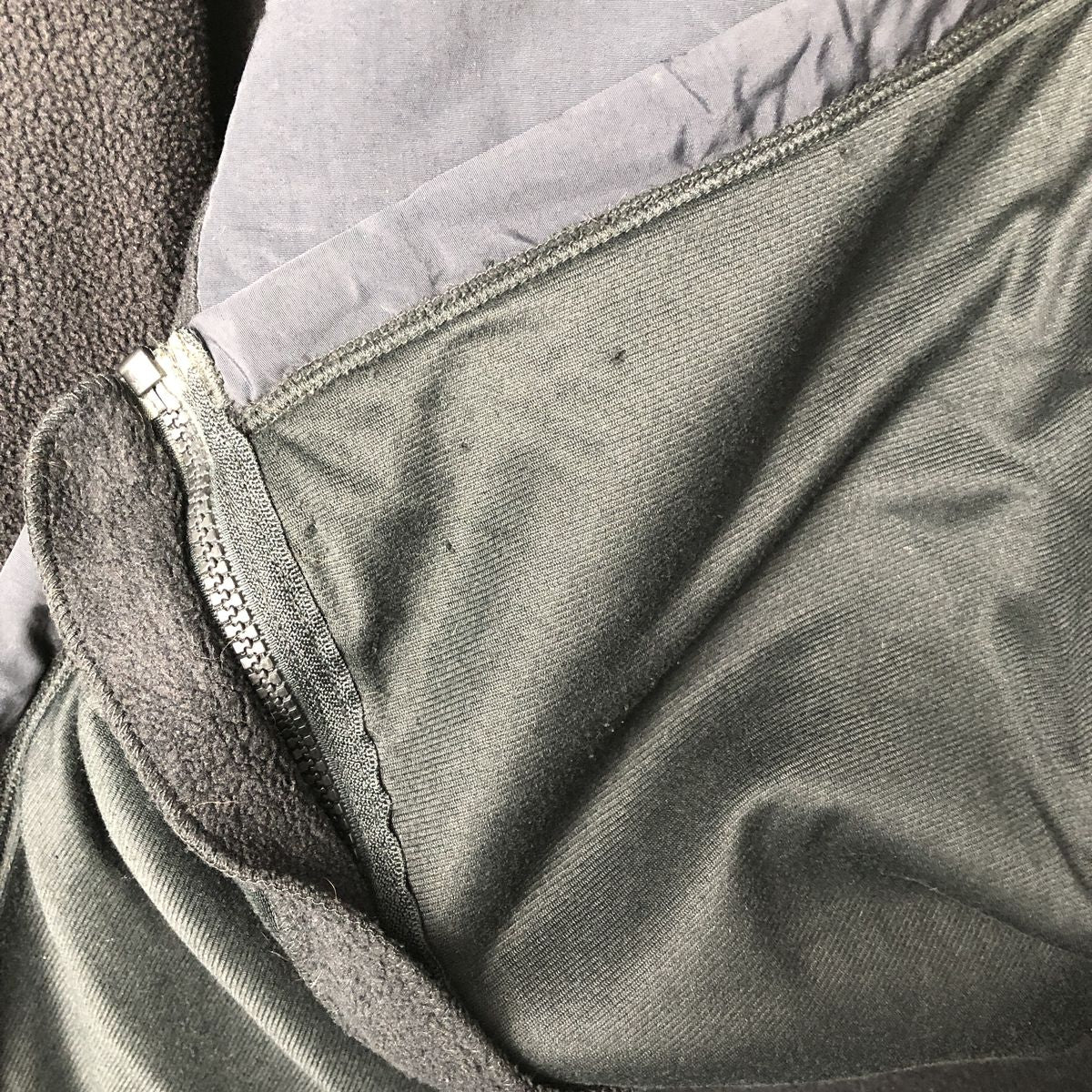- Front, zipper end tape peeling, stain on left chest and left hem
