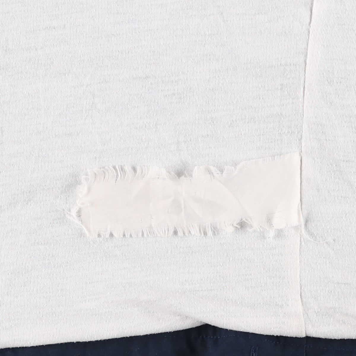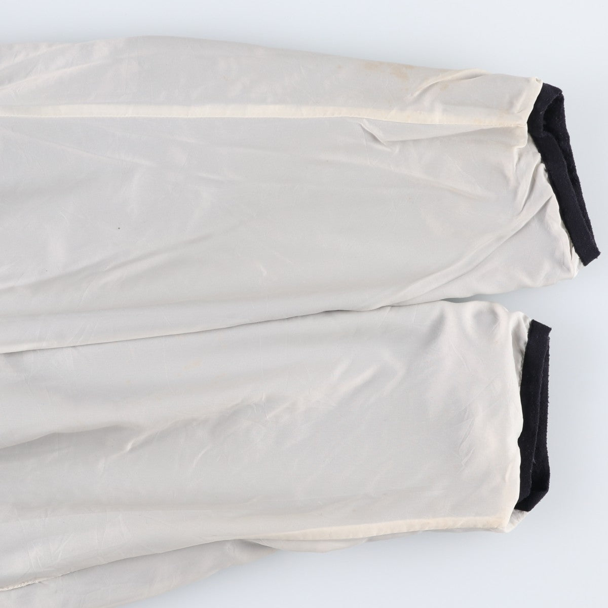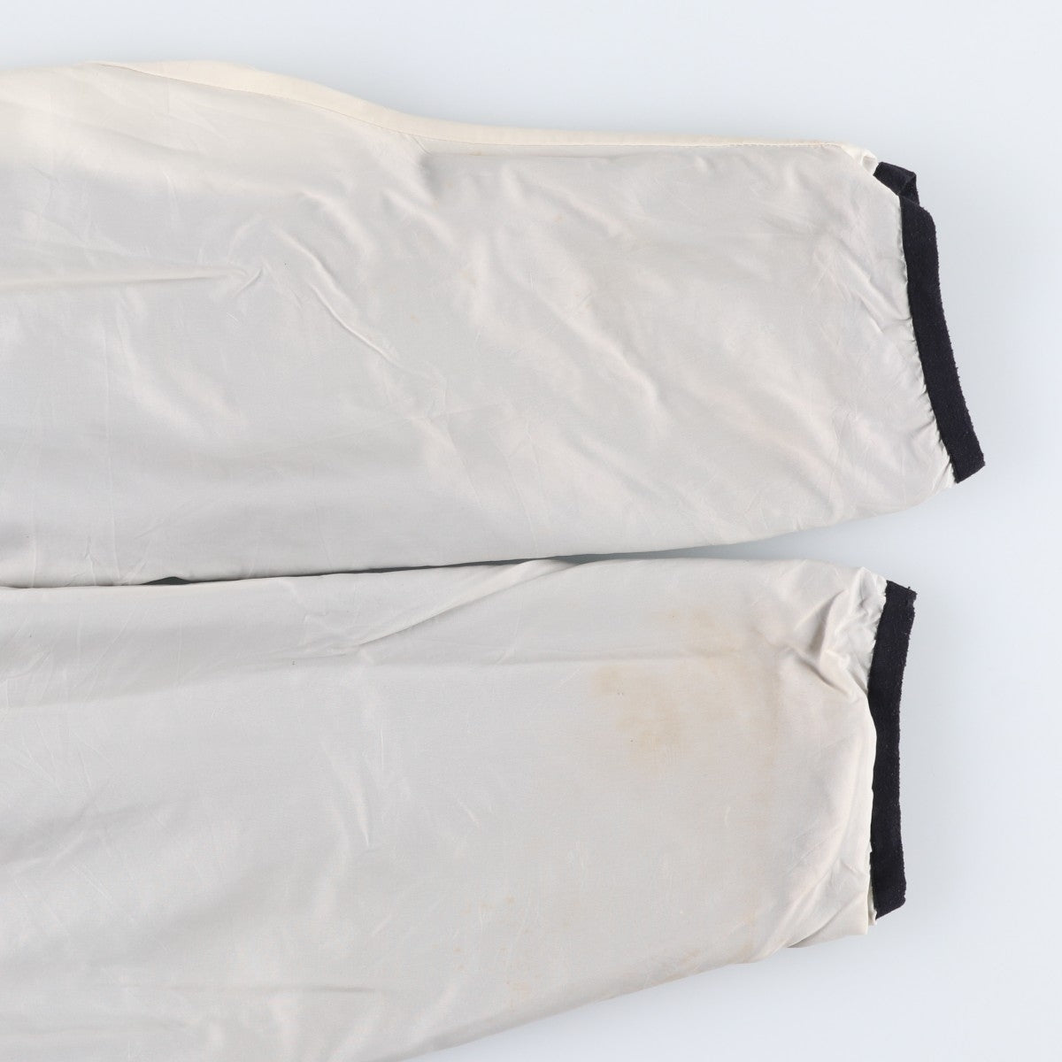-Stain on the front, left collar, abdomen, and both abdominal pockets. Burns on the right arm. Scratches on the right hem. Threads on both hems. Repair marks on both abdominal pockets.