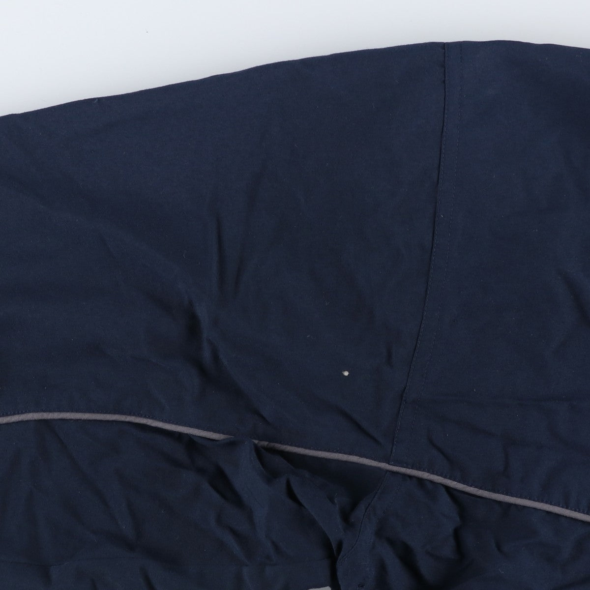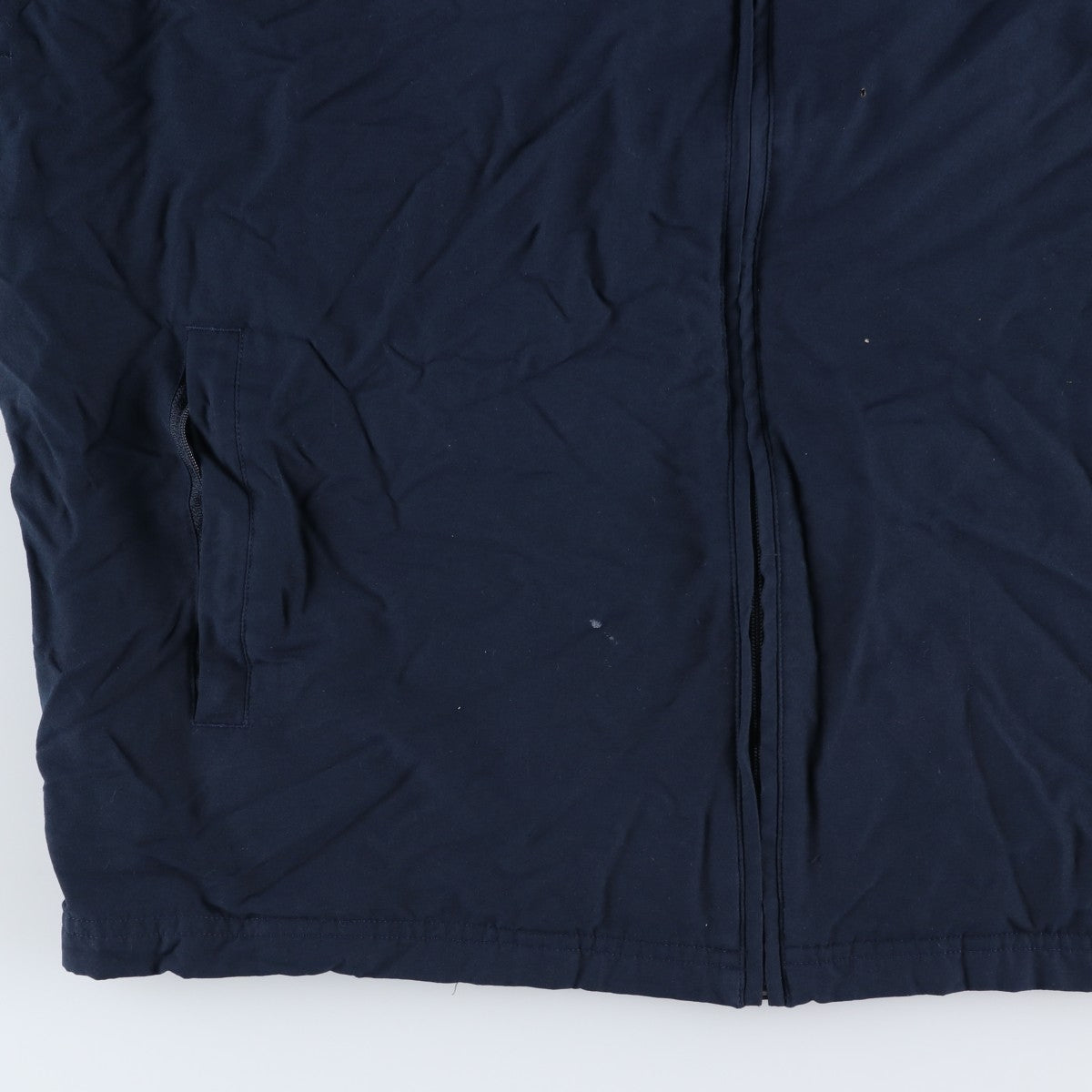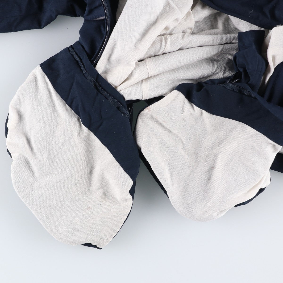 -Stain on the front, left collar, abdomen, and both abdominal pockets. Burns on the right arm. Scratches on the right hem. Threads on both hems. Repair marks on both abdominal pockets.